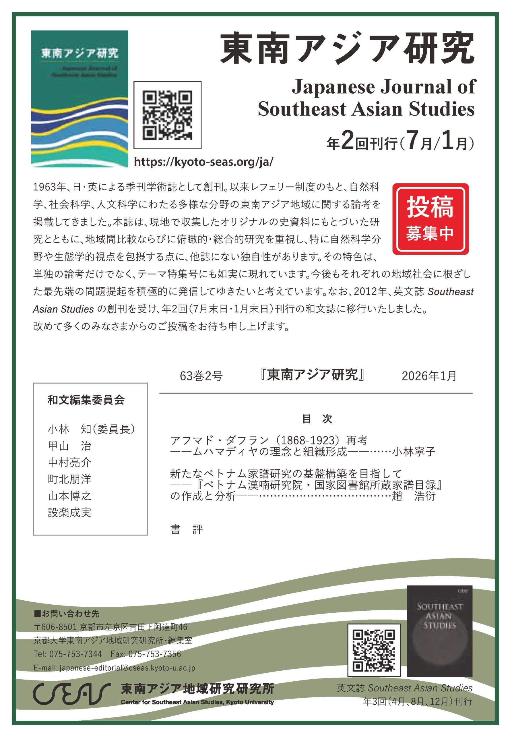 『東南アジア研究』では、東南アジア地域研究に寄与する論文の投稿を広く受け付けております。